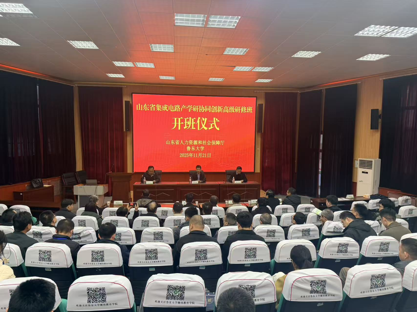 11月21日,由继续教育学院主办、集成电路学院承办的“山东省2025年集成电路产学研协同创新高级研修班”在我校开班。集成电路学院院长张立春教授到会致辞,继续教育学院院长李家普以及来自省内高校、研究院所和集成电路相关企业的43名学员出席开班仪式。开班仪式由集成电路学院副院长王立志主持。