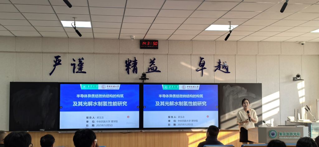 2025年12月5日,中央民族大学梁玉洁特聘教授应集成电路学院邀请,在北教22号楼401报告厅作题为“半导体异质结微纳结构的构筑及其光解水制氢性能研究”的学术报告。集成电路学院师生参加,卢太平主持报告会。