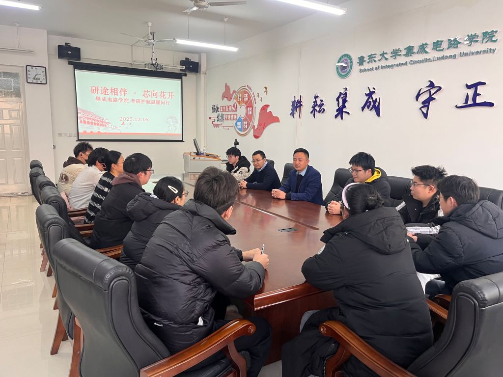 全国硕士研究生招生考试日益临近,备考进入冲刺关键阶段。为切实鼓舞学子备考士气,帮助大家缓解考前压力,集成电路学院于12月16日精心举办“研途相伴・芯向花开”考研护航座谈会。学院院长张立春、副教授卢太平与备考学生代表围坐一堂,现场氛围温馨而热烈,满溢着师生同心的暖意。